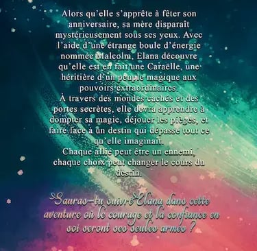 Propulsée dans l’existence d’un univers caché, elle découvre qu’elle appartient à un peuple magique et que son destin dépasse tout ce qu’elle imaginait. Guidée par Malcolm, une mystérieuse entité lumineuse, Elana devra maîtriser ses dons naissants, affronter des créatures redoutables et apprendre à faire confiance…