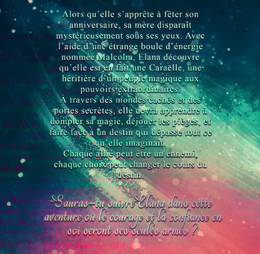 Propulsée dans l’existence d’un univers caché, elle découvre qu’elle appartient à un peuple magique et que son destin dépasse tout ce qu’elle imaginait. Guidée par Malcolm, une mystérieuse entité lumineuse, Elana devra maîtriser ses dons naissants, affronter des créatures redoutables et apprendre à faire confiance…